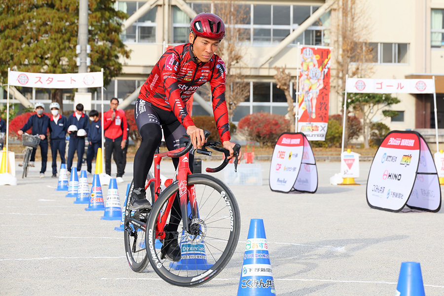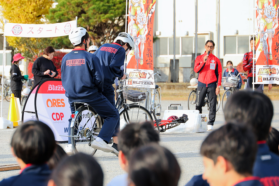 小野寺玲選手と廣瀬GMの2名が講師として参加し、全校生徒約300名を対象に、交通安全○✕クイズや実技を通じて自転車の安全な乗り方や交通ルールについて学んでいただきました。