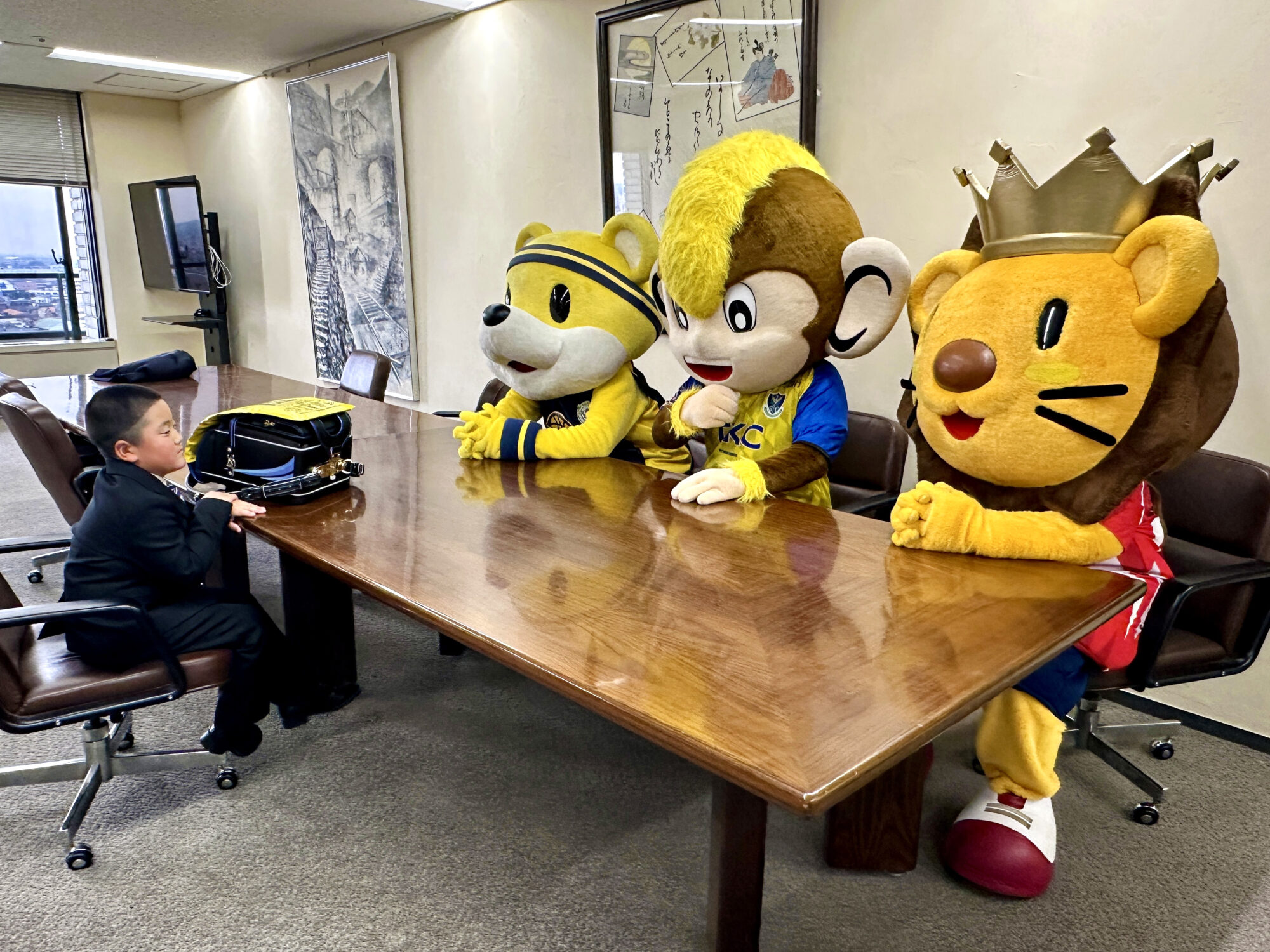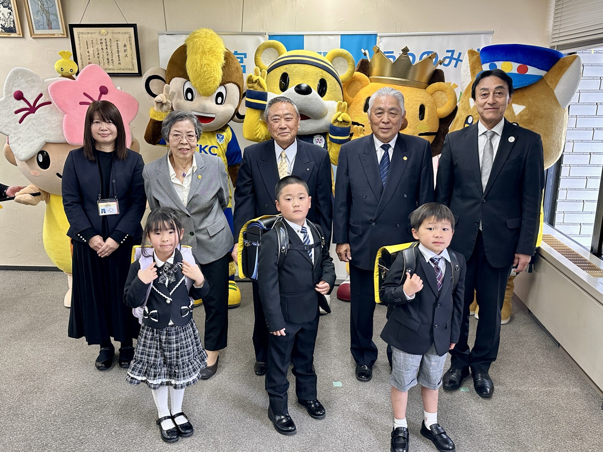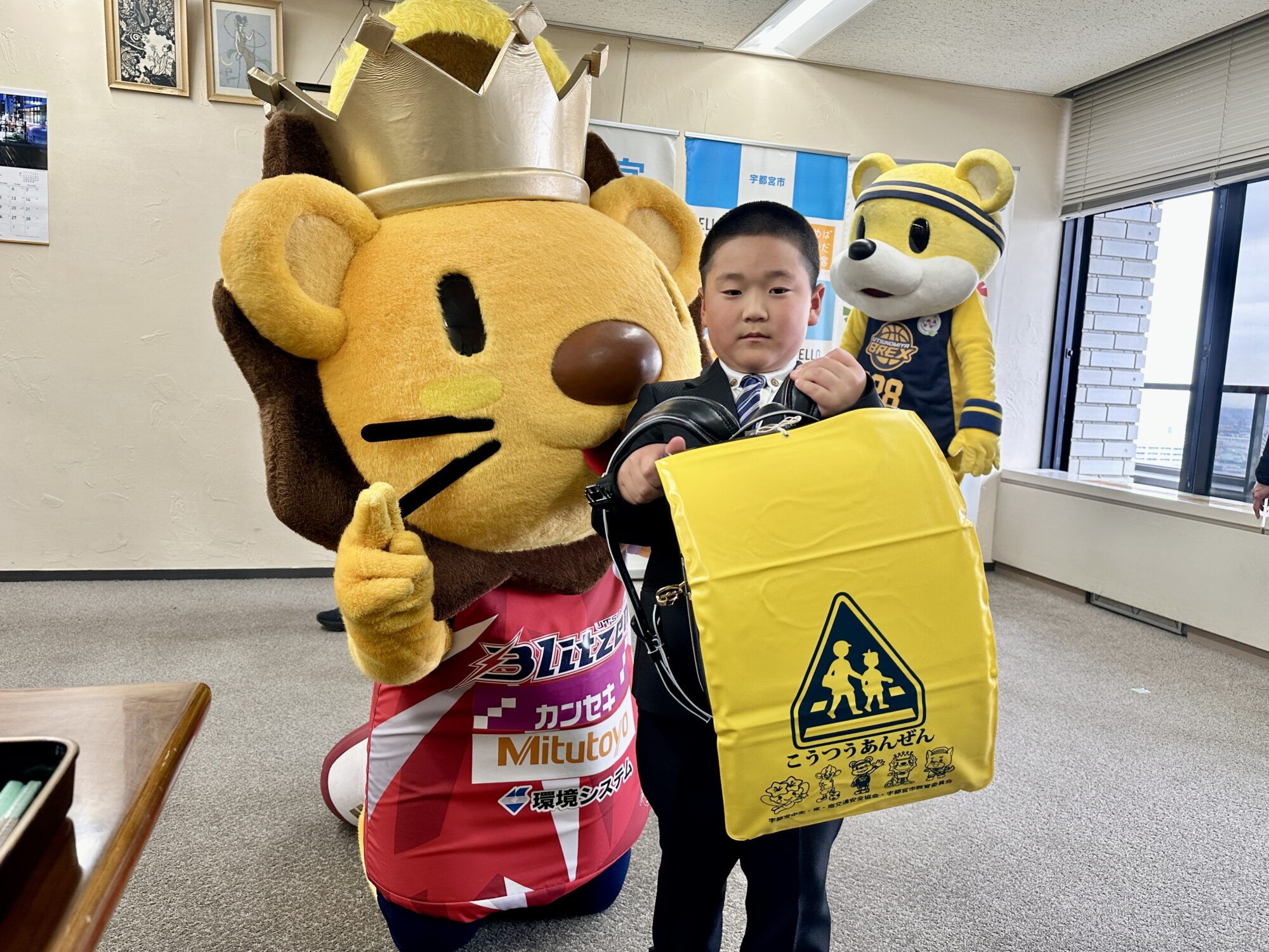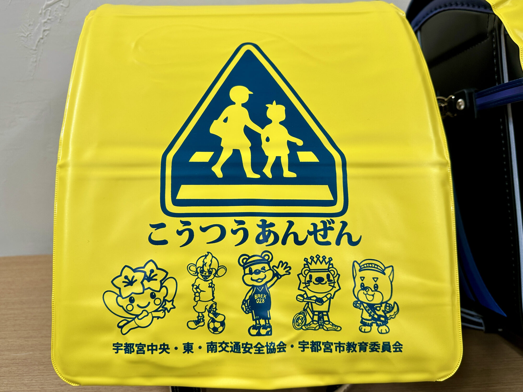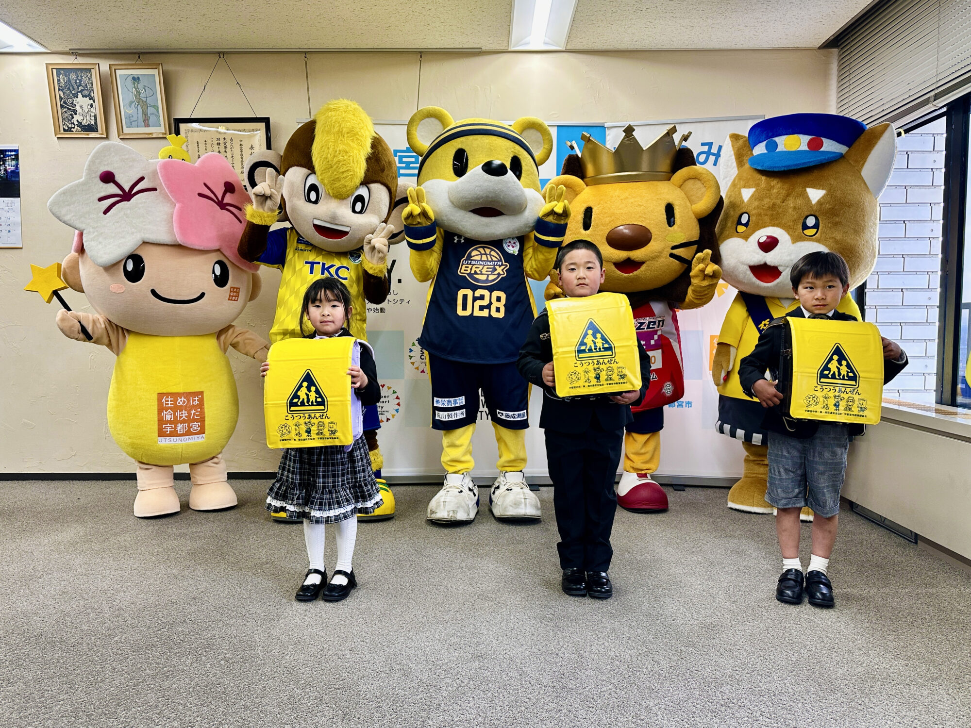 式には、市内の小学校に入学する新入生の代表3人が参加。黄色いランドセルカバーが手渡されました。カバーにはマスコットたちのイラストがデザインされており、登下校時にドライバーが子どもたちに早く気づけるようにすることで、交通事故を防ぐ目的があります。