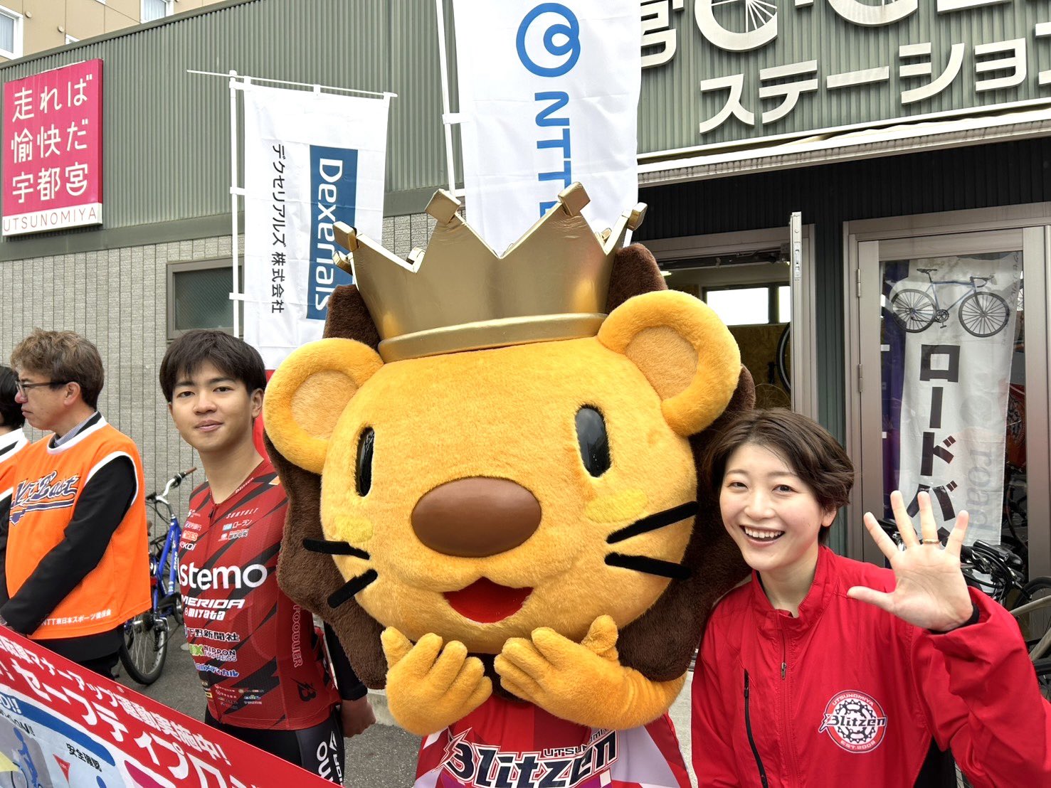Astemo宇都宮ブリッツェンからは菅野蒼羅選手、ブリッツェンラヴァーズのYUU、マスコットのライトくんが参加し、駅を利用される皆さまに元気にあいさつを行いました。
