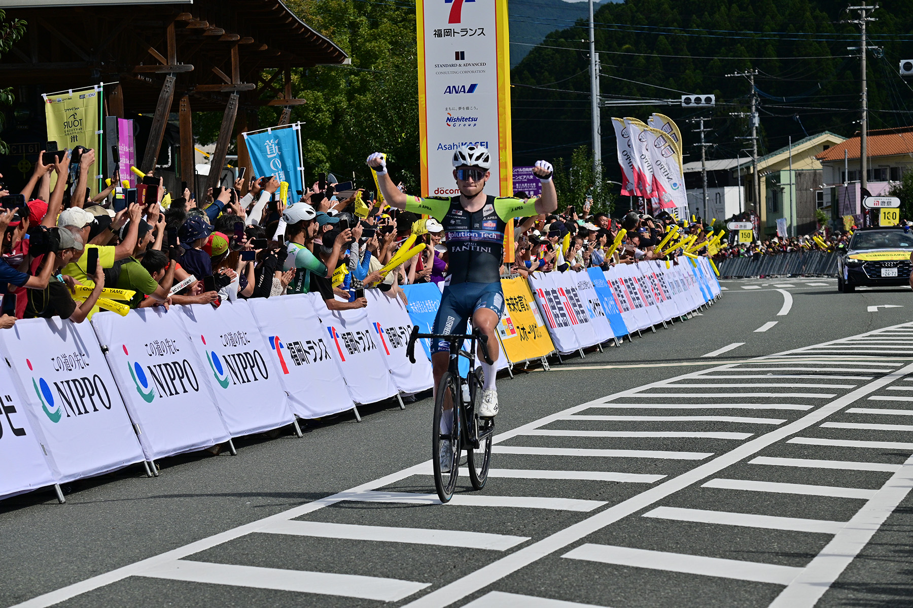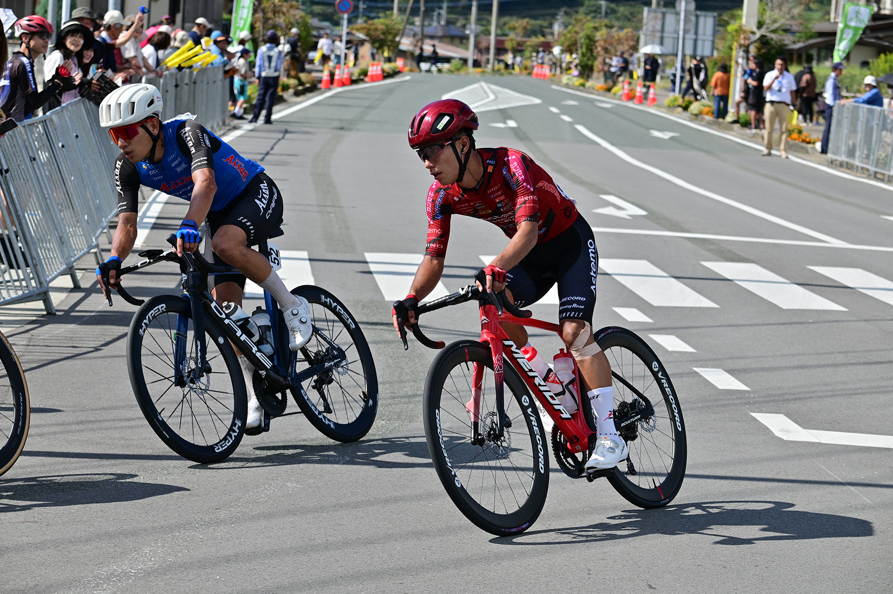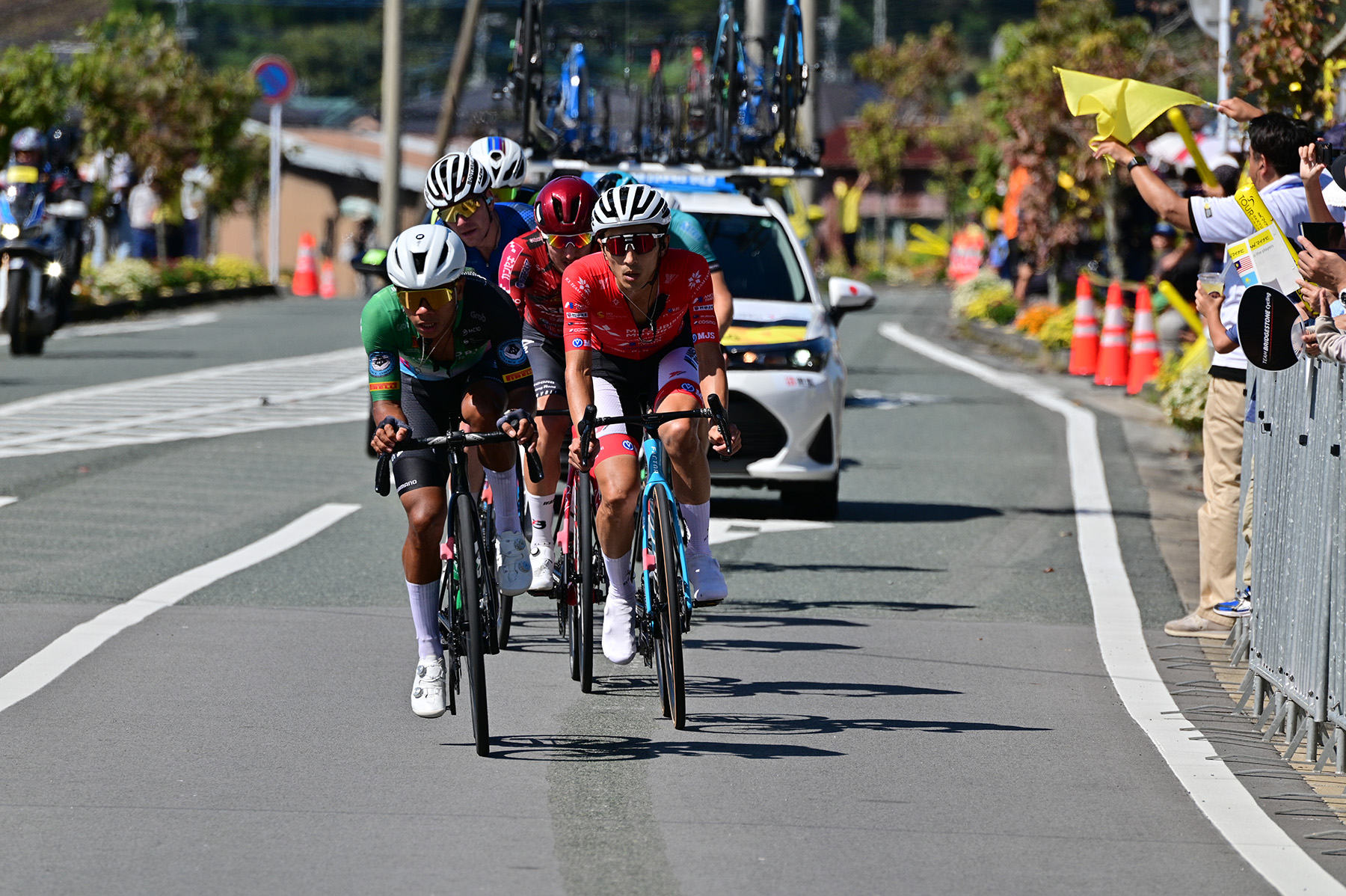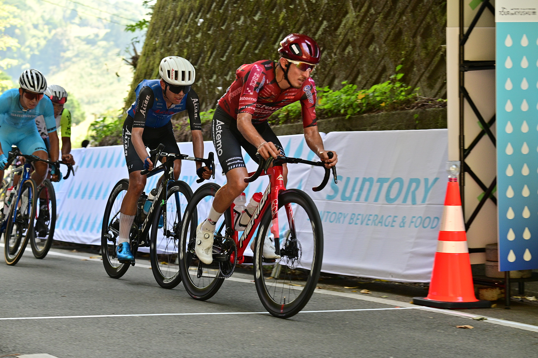 メイン集団はトタルエナジーズがコントロールし、次の決め手となった動きは残り26km。アレッサンドロ・ファンチェル選手(TEAM UKYO)がアタックし、それに追走した選手も含めて13名の逃げができた。日本人選手は入っておらず、ファンチェル選手以外の主なメンバーは、ジョルダン・ジェガット選手(トタルエナジーズ)、ニコロ・ガリッボ選手(TEAM UKYO)、ニコラス・ヴィノクロフ選手、ヘノック・ムルブラン選手(以上XDS・アスタナ)、ベンジャミ・プラデス選手(VC福岡)、ジョゼフ・ピドコック選手(Q36.5プロサイクリングチーム)、ルーカ・ファンボーヴェン選手(アンテルマルシェ・ワンティ)、キリロ・ツァレンコ選手(ソリューションテック・ヴィーニファンティーニ)、レイン・タラマエ選手(キナンレーシングチーム)。このうち、残り16km地点でのタラマエ選手のアタックをきっかけに、ツァレンコ選手とガリッボ選手が追走に成功し3名の逃げが形成された。残り9km地点、最後の山岳ポイントにかかる上りでガリッポ選手が脱落し、勝負はタラマエ選手とツァレンコ選手に絞られた。