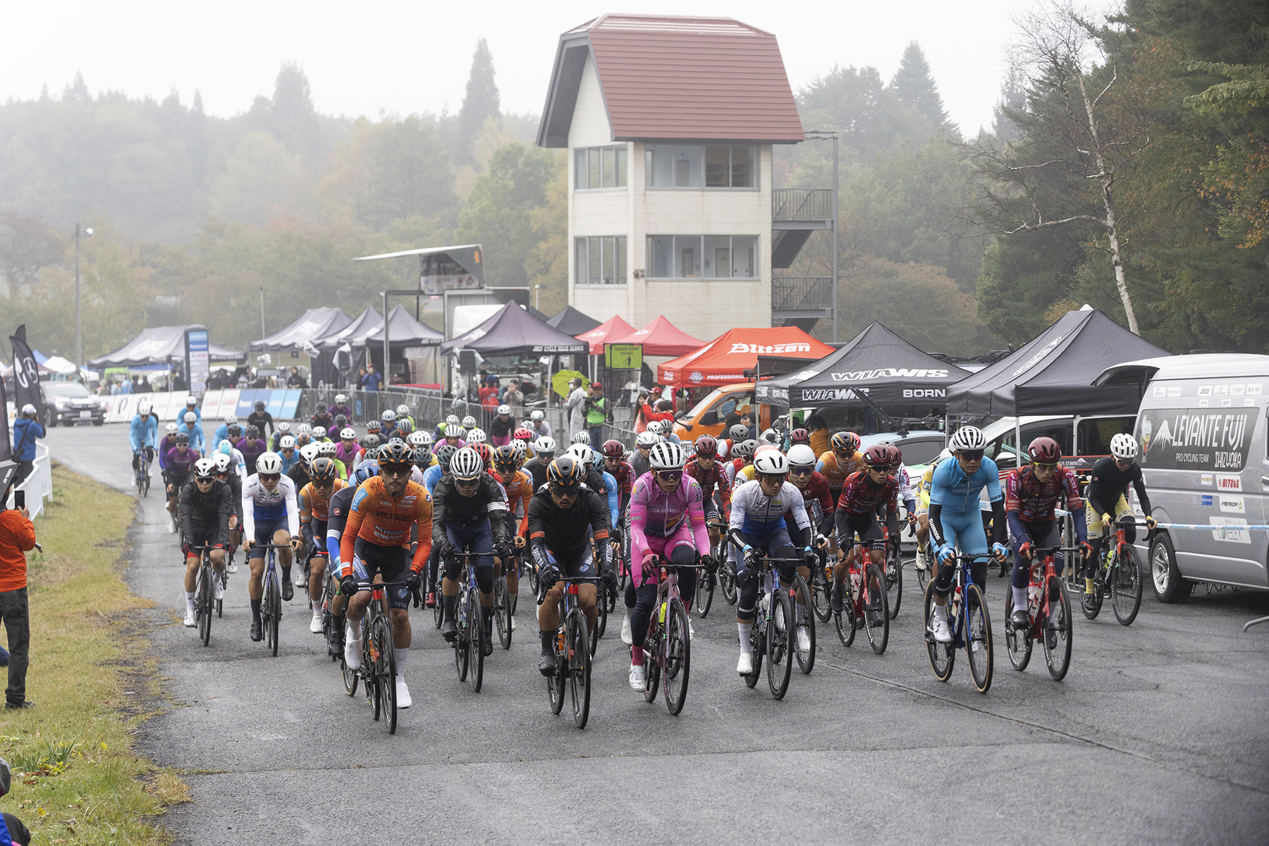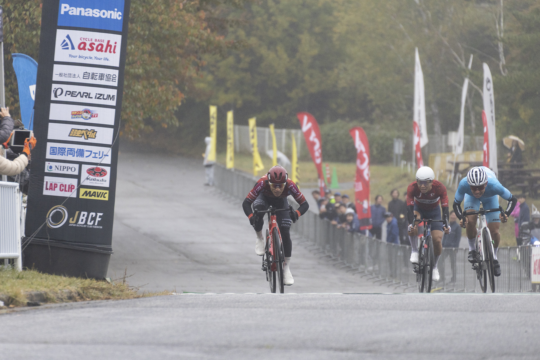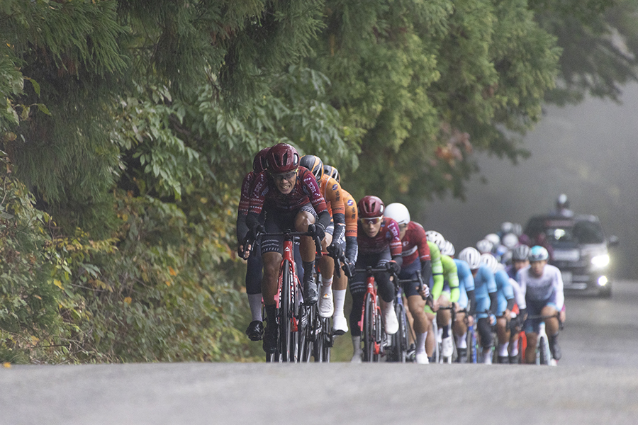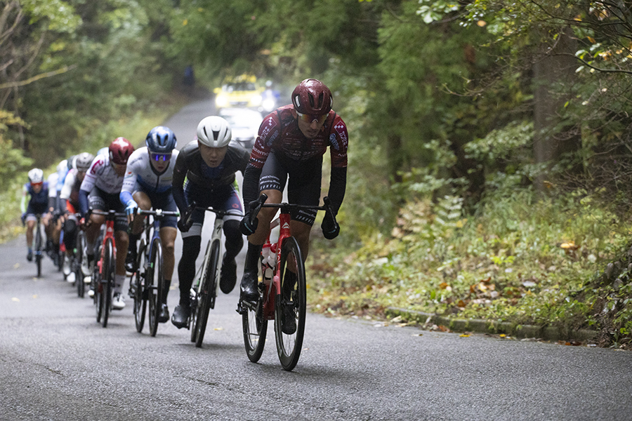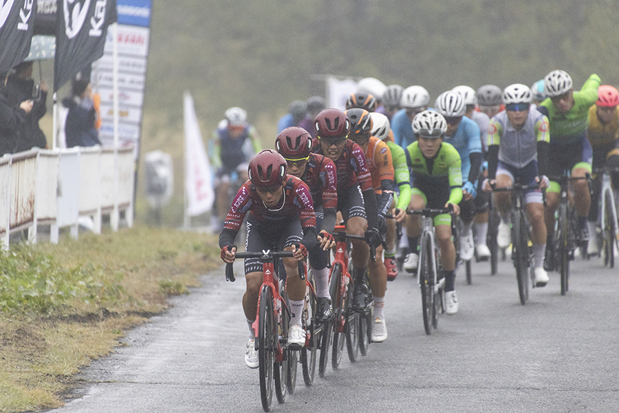 群馬サイクルスポーツセンターのコースは平坦区間が少なく、特に残り2kmあたりにある通称「心臓破りの坂」が厳しく、勝負の決め手となる。しかも今日は霧雨が降り、雲が厚く、気温が10度前後。過酷な気象条件でのレースになることが予想された。
