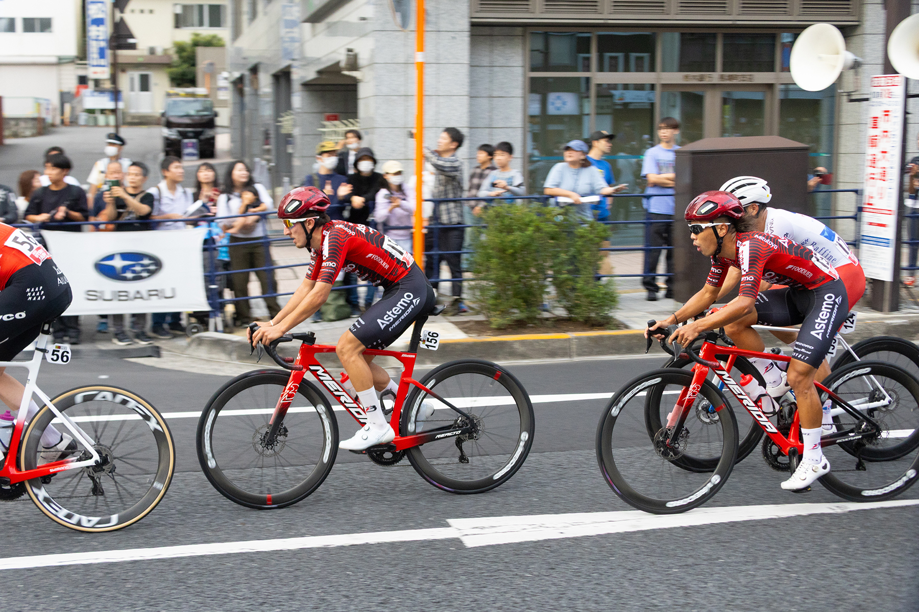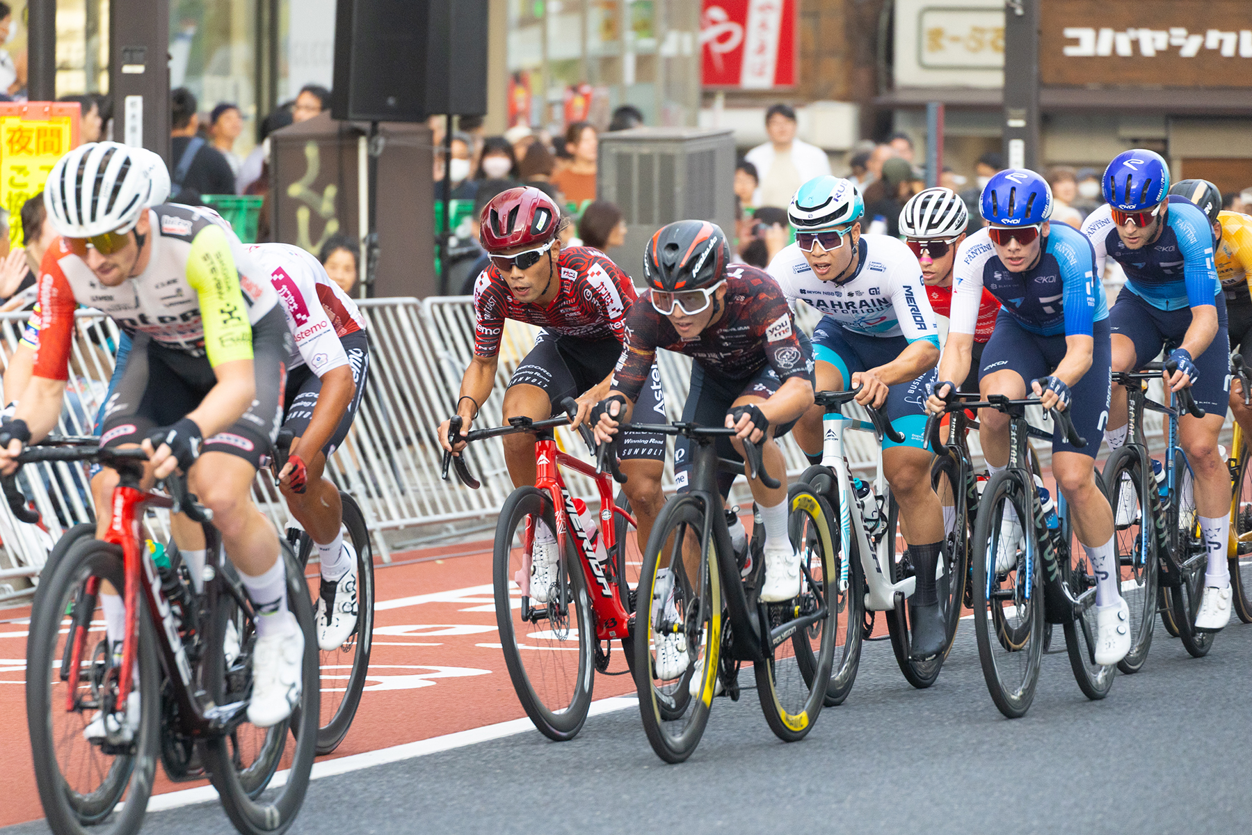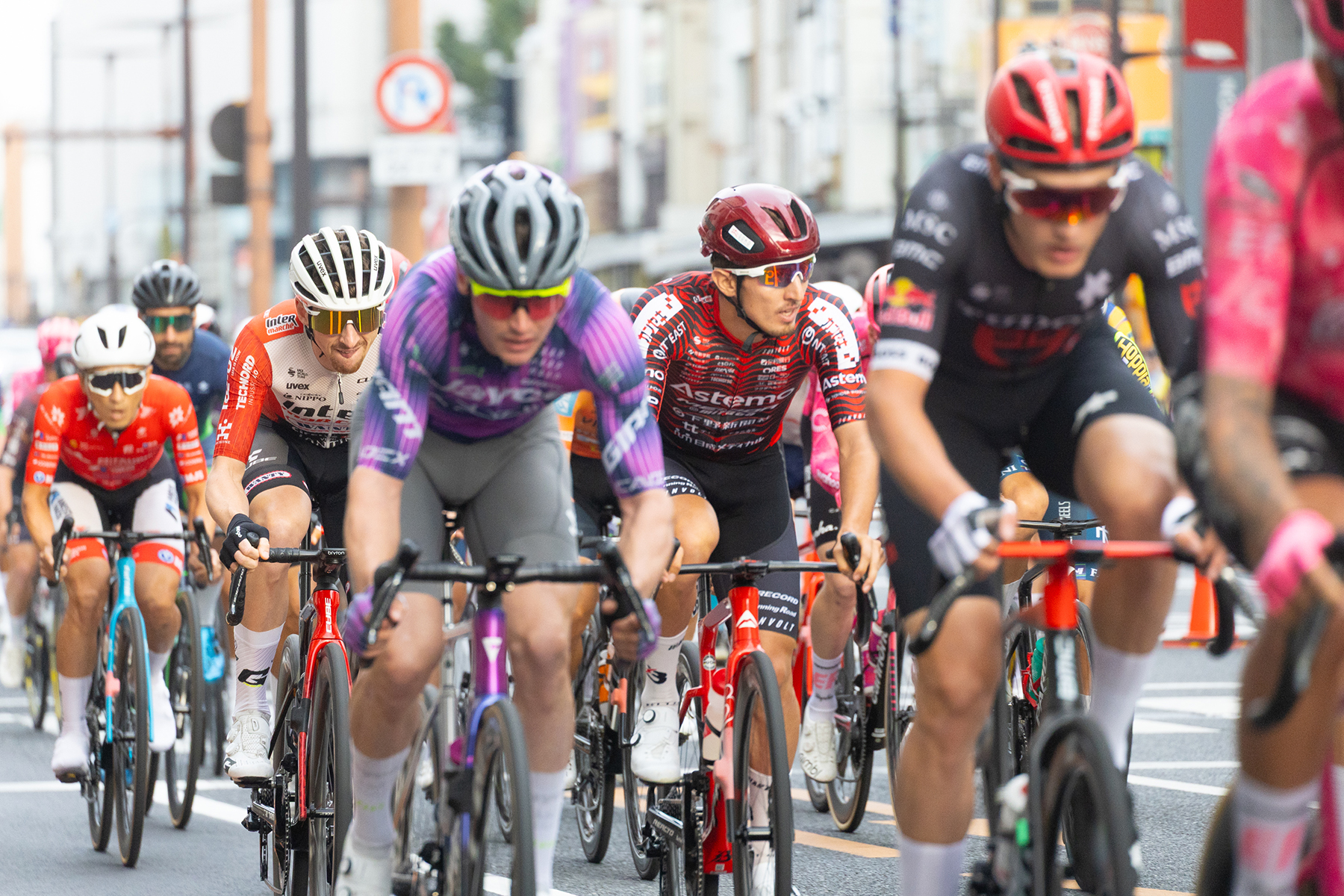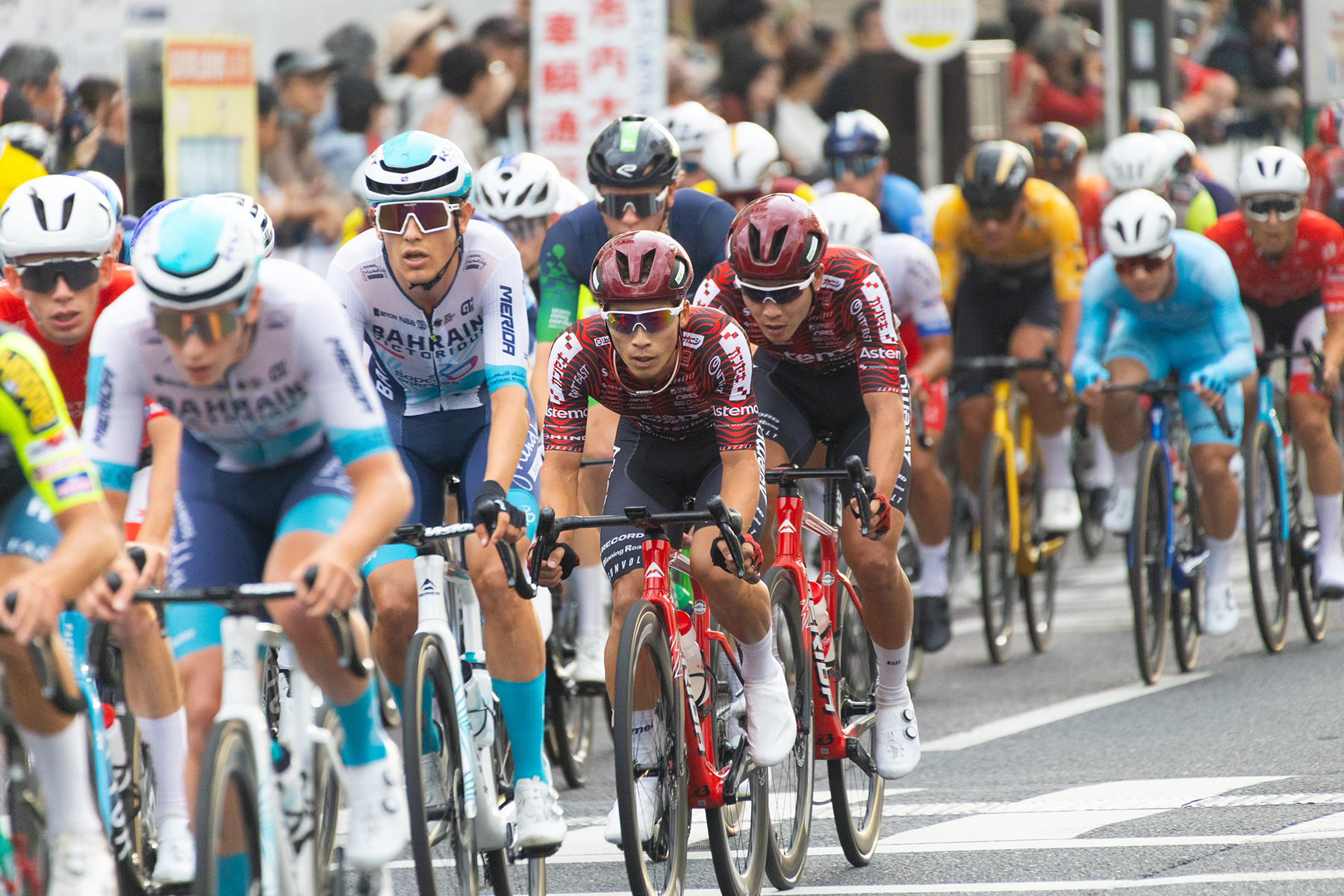 スタート直後から積極的にUCIワールドツアーチームが前に出て、レースは早々にハイスピードな展開に。集団が長く伸びる中、4名の選手が抜け出しに成功。そこに今年のツール・ド・フランスでポイント賞「マイヨ・ヴェール」を獲得したジョナタン・ミラン選手(リドル・トレック)たちも加わり9名に。しかし後続と差は広がらず、5周回目を終えると集団はひとつに。世界のトップ選手たちが見せつける「本場のスピード」に、国内チーム勢は集団後方ながら食らいついていく。