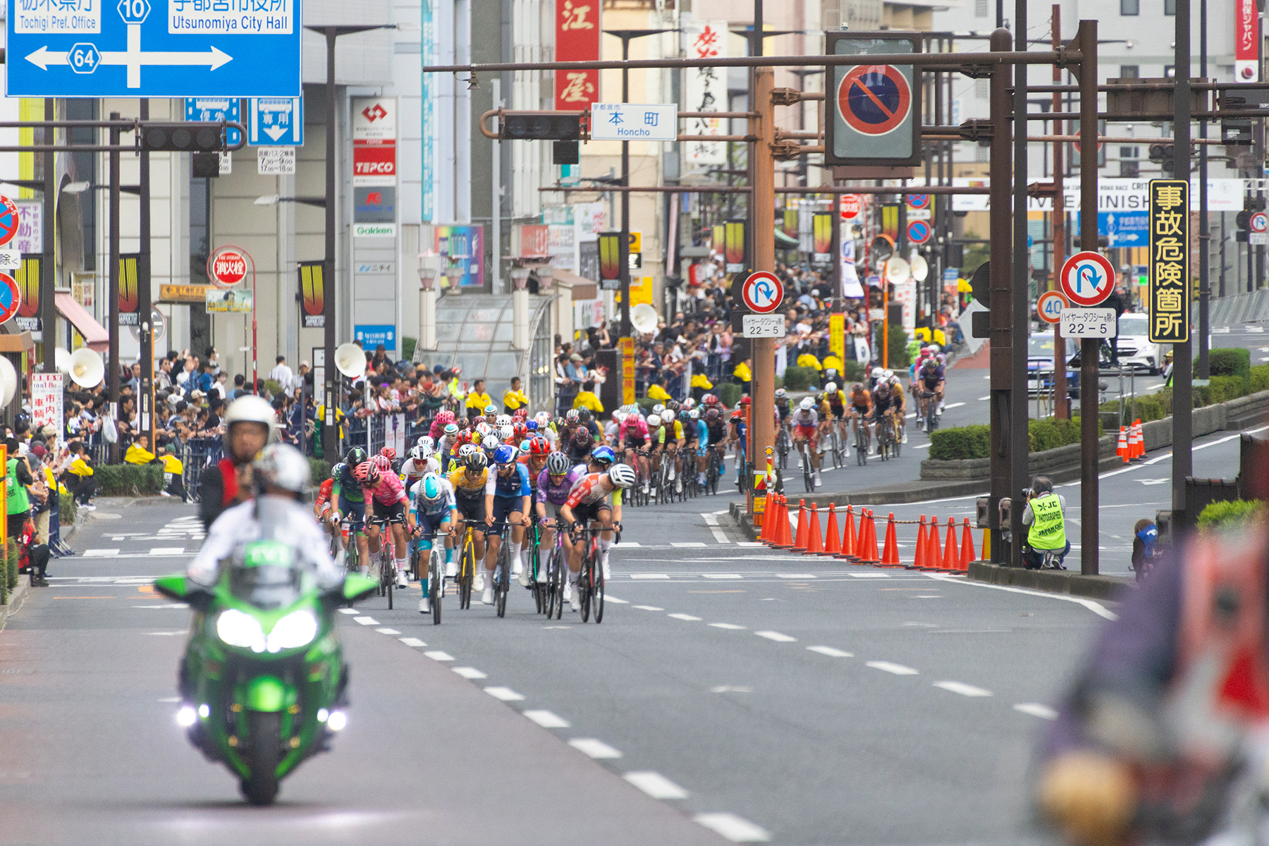 15時40分にスタートの号砲が鳴ると、選手たちは一斉に飛び出した。宇都宮市大通り周回コースはスタートすると東武馬車道通りでJR宇都宮駅方面へと折り返し、残り約700mほどの上河原交差点で再び折り返す。スタート/フィニッシュ地点となる宇都宮二荒山神社前はフィニッシュに向けて登る緩い傾斜があり、最後にもう一度踏み込める脚力が試される。最後はスプリンターの争いになるだろう。