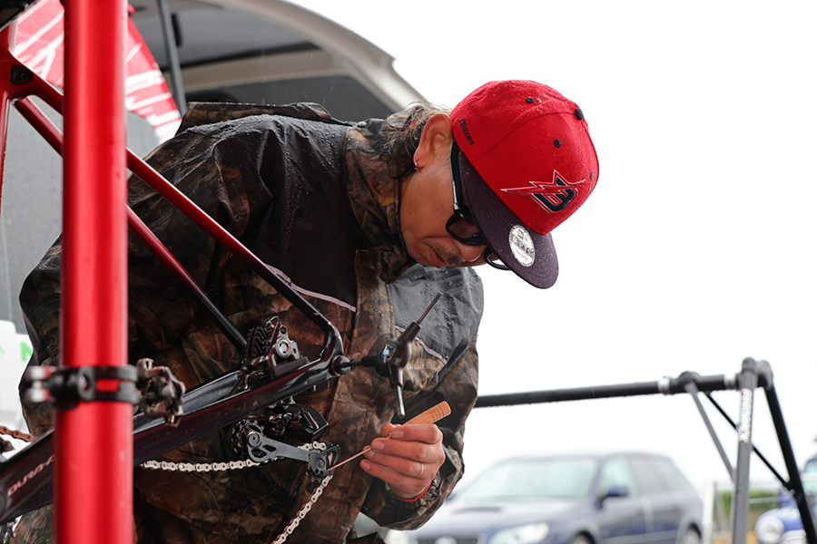 今回のレースの舞台は、付近に海や温泉もある鳥の海公園。距離は1周3kmで、急こう配の上りも含まれている厳しいコースだ。しかも会場入りした際は小雨。泥が多い状況だった。