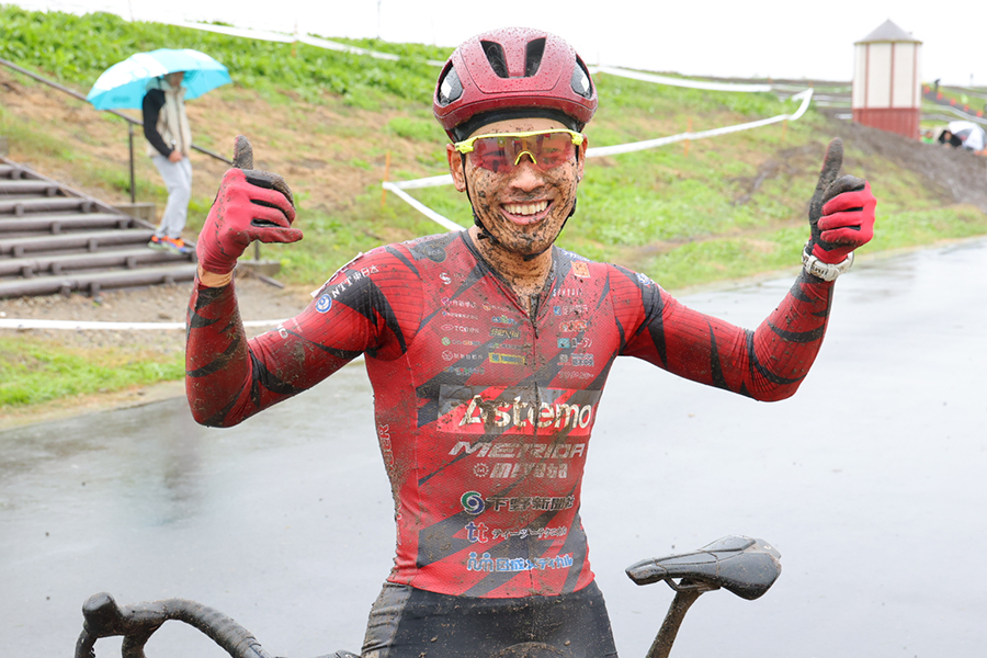 その後も冷静に走り続けた沢田。最後は独走となり笑顔でフィニッシュラインをトップで通過し、今季シクロクロス初出場で優勝を飾った。出走者75名で完走者はわずか10名の厳しいレースを制した。