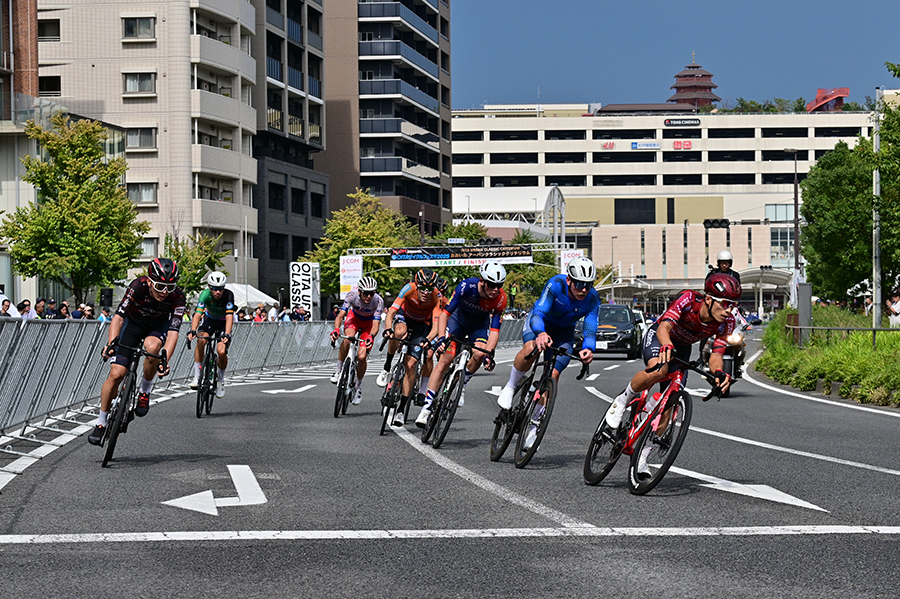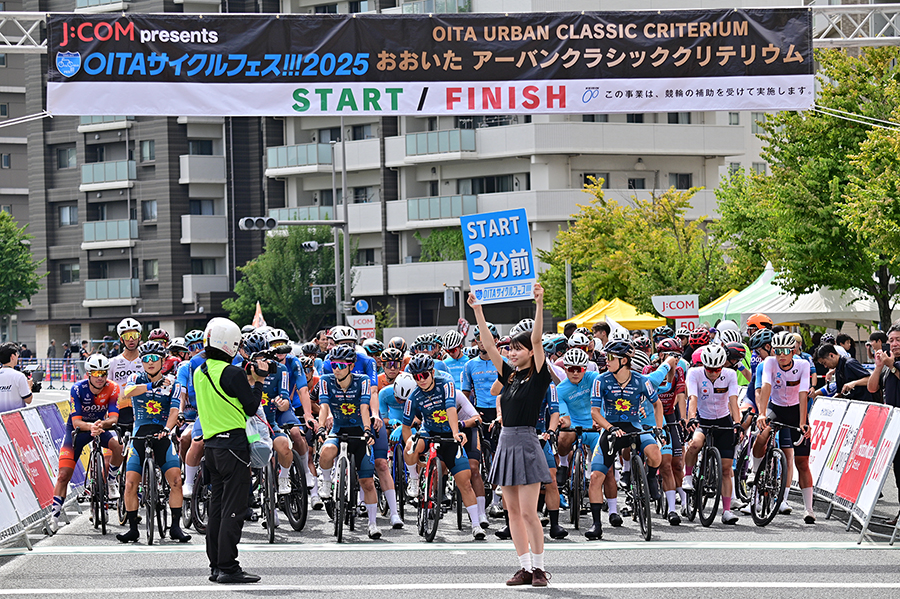 大分の市街地で開催される自転車競技の祭典「OITAサイクルフェス!!! 2025」の初日、大分駅前で「おおいたアーバンクラシッククリテリウム」が開催された。UCI-クリテリウムにカテゴライズされる国際レースだ。大分駅から伸びる「大分いこいの道」にておこなわれるため、多くの市民の方に楽しんでいただけるレースであるが、今年は駅前ロータリーもコースに入り、1周が昨年より200m伸びて1.2kmに。さらに多くの方にレースを見てもらえる環境下で、35周する総距離42kmのクリテリウムとなった。180度ターンや、左右とカーブする複合コーナーもあり、勝負に絡み、かつ安全に走るためには、そのコーナリングテクニックも問われる。
