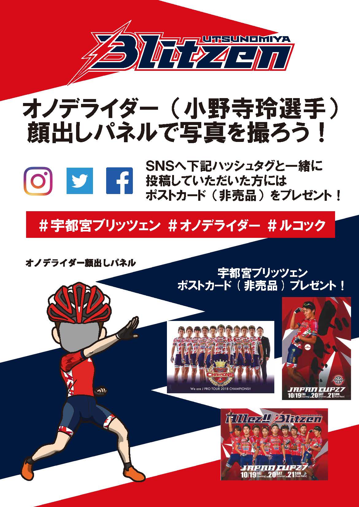 「2018ツールド・フランス さいたまクリテリウム」の併催イベント「2018サイクルフェスタ」の宇都宮ブリッツェン物販ブースに小野寺玲選手(オノデライダー)の顔出しパネルを設置します。